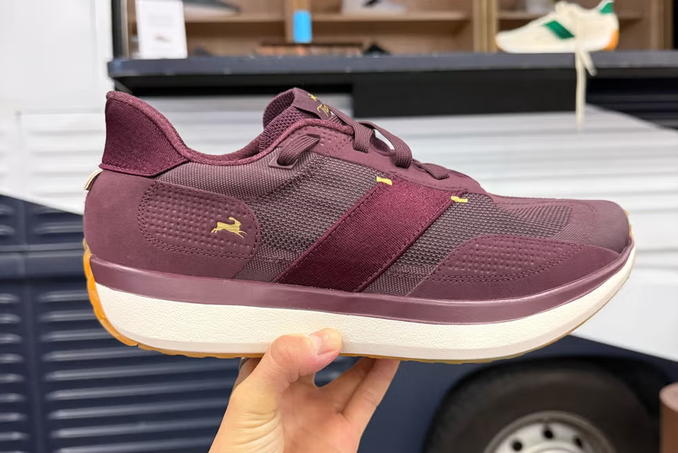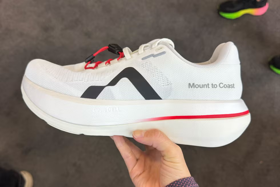 I received my Tracksmith email before I went through the convention centre doors: the Hare is releasing a max-cushioned running shoe. The vision behind the Eliot Ryder is ‘clean, not clunky’. That 45mm stack height hides a 25mm ATPU foam midsole. This portable foam is a nod to the Eliot Racer’s removable TPU sockliner. If there was an award at the trade show for thickest drop-in midsole, Tracksmith has no competition. The sleek super trainer is intended for everyday runs (and looks snazzy semi-formal street shoe).