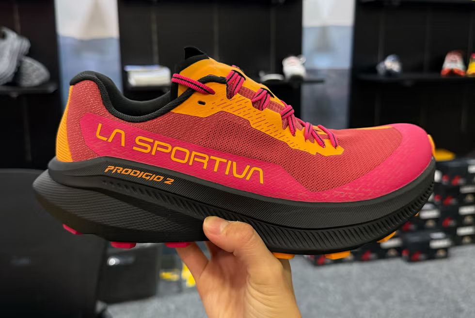 The La Sportiva team took cues from the Prodigio Pro, which was included in our 2025 Shoe Awards. The Prodigio 2 has a more accommodating fit with a wider platform in the forefoot and higher instep. The responsive nitrogen-infused EVA supercritical foam is also softer. The rocker is further forward, with more cushioning in the forefoot. The shoe is approximately the same weight and same stack height (34mm in the heel, 28mm in the forefoot) as the previous iteration, with 4mm lugs on the outsole for reliable grip on the trails.