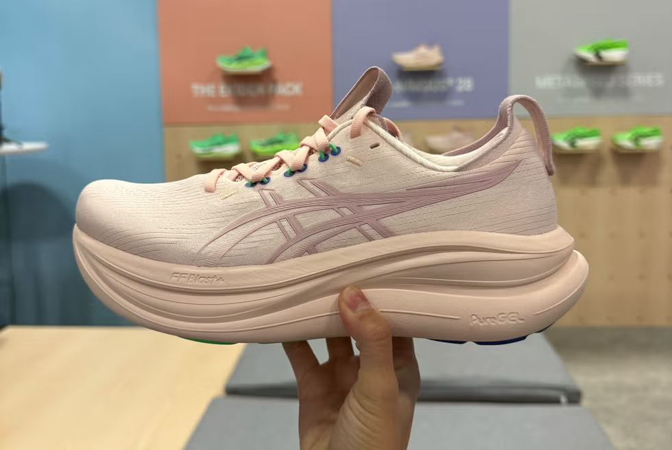 Asics didn’t want to change the plush, soft underfoot cloud-like experience. Upgrades include lighter weight with a high stack height (43.5mm in the heel). The Gel-Nimbus 28 weighs almost 30g less than the previous iteration.